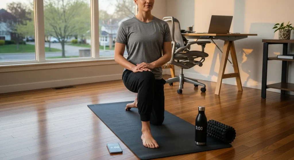 - Micro-breaks: 30–60 seconds of movement every 60–90 minutes (even standing and reaching helps)